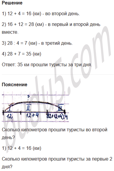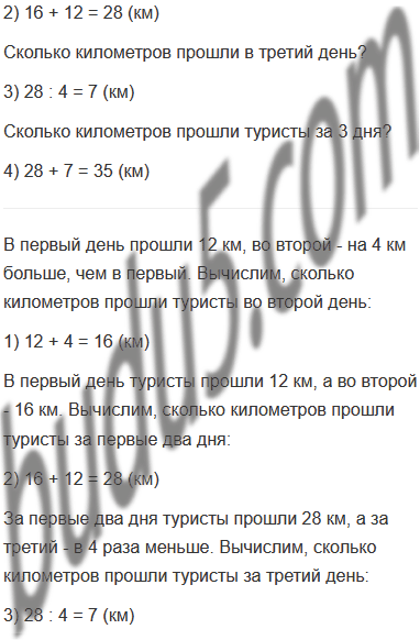 Задание № 9. Туристы отправились в поход. В первый день они прошли 12 км, во второй - на 4 км больше, чем в первый, а в третий день - в 4 раза меньше, чем в первый и во второй дни вместе. Сколько километров прошли туристы за эти три дня?