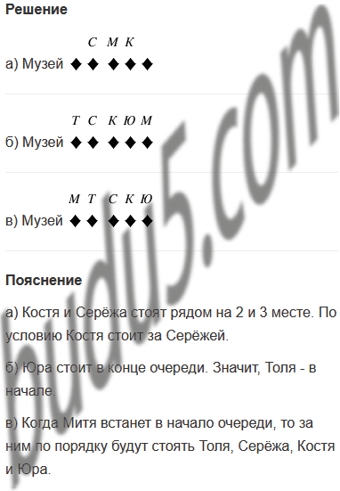 Задание № 14. Митя, Серёжа, Юра, Толя и Костя пришли в музей до открытия и встали в очередь. Если бы Митя встал посередине очереди, он стоял бы между Серёжей и Костей, а если бы Митя встал в конце очереди, то рядом с ним стоял бы Юра. Но Митя встал впереди своих товарищей. Кто за кем стоит, если известно, что Костя стоит за Серёжей?