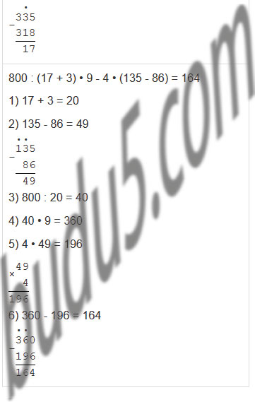 | 800 : (17 + 3) • 9 - 4 • (135 - 86) |