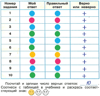 Выполняя задания учебника, заполняем таблицу. В столбце "Мой ответ" закрашиваем кружок в тот цвет, который, на наш взгляд, соответствует правильному ответу. В столбце "Правильный ответ" закрашиваем кружки так, как показано на "Страничках для самопроверки". Сравниваем эти два столбца и заполняем третий: если наш ответ правильный, ставим знак "+", если неправильный – знак "-".