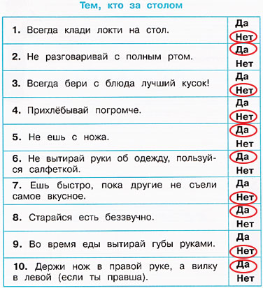 4. Попугай спешит посоветовать, как нужно вести себя за столом. Каким советам ты последуешь, а каким – нет? Обведи "Да" или "Нет".