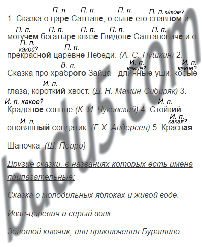 Доказываем правописание окончаний: (о) царе Салтане (П. п., ед. ч., м. р.); (о) сыне (П. п., ед. ч., м. р.); славном, могучем богатыре князе Гвидоне Салтановиче (П. п., ед. ч., м. р.); (о) прекрасной царевне (П. п., ед. ч., ж. р.); храброго (В. п., ед. ч., м. р.); длинные, косые (В. п., мн. ч.); короткий (В. п., ед. ч., м. р.); краденое (И. п., ед. ч., ср. р.); стойкий оловянный (И. п., ед. ч., м. р.); красная (И. п., ед. ч., ж. р.).