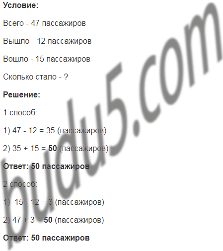 В троллейбусе ехали 47 пассажиров. На остановке 12 пассажиров вышли и 15 вошли. Сколько стало пассажиров в троллейбусе? Решите задачу двумя способами.