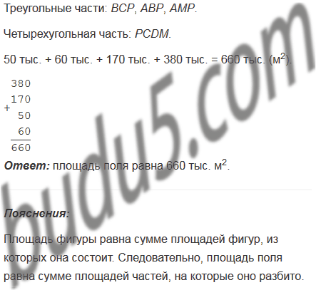 Пятиугольное поле АВСDМ, план которого изображен на рисунке 111, разбито на четыре части отрезками АС и ВМ. Назовите эти части и найдите площадь поля, если площади треугольных частей равны 50 тыс. м2, 60 тыс. м2, 170 тыс. м2, а четырехугольной - 380 тыс. м2.