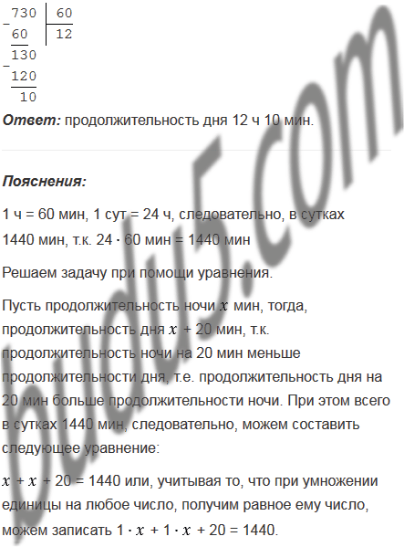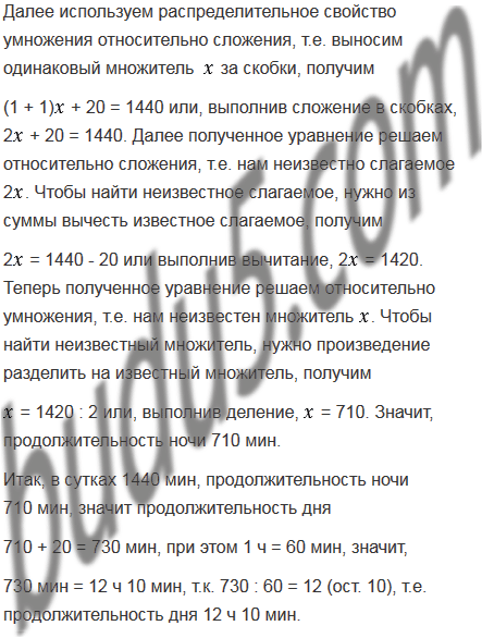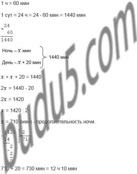 В одни из суток года продолжительность ночи на 20 мин меньше продолжительности дня. Сколько времени длится день в эти сутки?