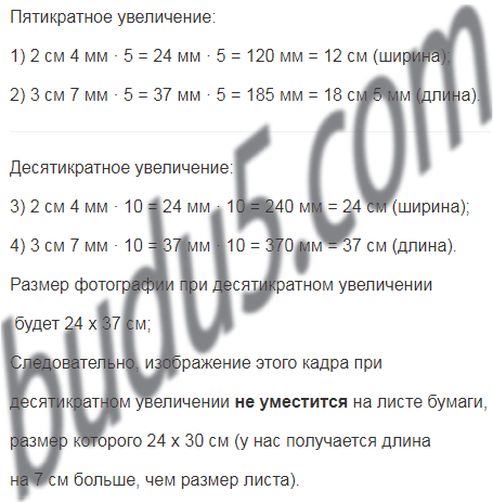 На рисунке 2 изображён в натуральную величину один кадр фотоплёнки. Каких размеров получится фотография при пятикратном увеличении? Уместится ли изображение этого кадра при десятикратном увеличении на листе бумаги, размер которого 24 х 30 см?