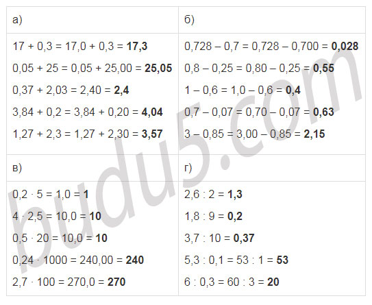 | 17 + 0,3 0,05 + 25 0,37 + 2,03 3,84 + 0,2 1,27 + 2,3 | 0,728 ‒ 0,7 0,8 ‒ 0,25 1 ‒ 0,6 0,7 ‒ 0,07 3 ‒ 0,85 | 0,2 ∙ 5 4 ∙ 2,5 0,5 ∙ 20 0,24 ∙ 1000 2,7 ∙ 100 | 2,6 : 2 1,8 : 9 3,7 : 10 5,3 : 0,1 6 : 0,3 |