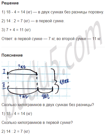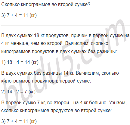 Задание № 3. В двух сумках 18 кг продуктов, причём в первой сумке на 4 кг меньше, чем во второй. Сколько килограммов продуктов в каждой сумке?