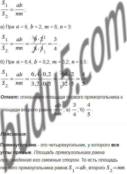 Длина прямоугольника см, а ширина см. Длина другого прямоугольника см, а ширина см. Найдите отношение площади первого прямоугольника к площади второго. Найдите значение получившегося выражения, если: