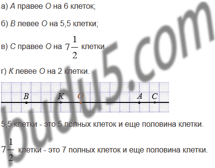 б) В левее О на 5,5 клетки;