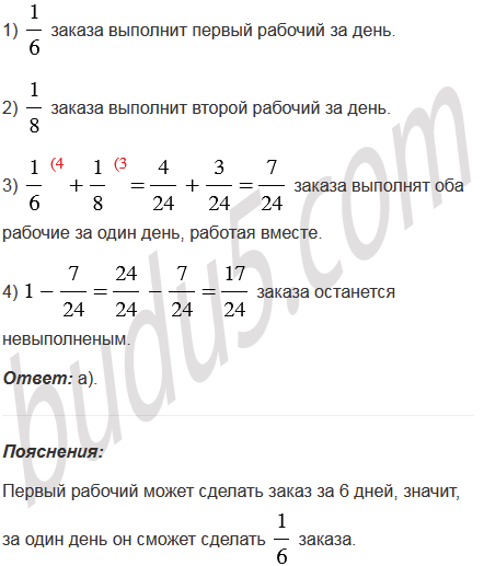 Один рабочий может сделать заказ за 6 дней, а другой за 8 дней. Какая часть заказа останется невыполненной после их совместной работы за один день?