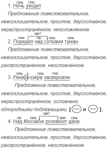 1. Ночь уход..т. 2. Поредел над сопками туман. 3. Реки и озёра засверкали. 4. Над Москвою розове..т дали. 5. Утро начинается в Москве. 6. Я горжусь тобой, друг! 7. Не работа сушит, а забота. 8. Не печь кормит, а руки.