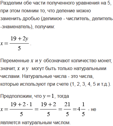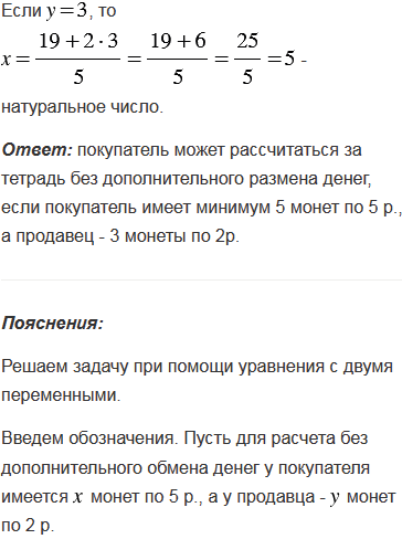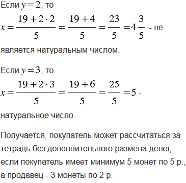 Тетрадь стоит 19 р. У покупателя имеются монеты только по 5 р., а у продавца - только по 2 р. Может ли покупатель рассчитаться за тетрадь без дополнительного размена денег? В случае утвердительного ответа, определите, какое наименьшее количество монет соответствующего достоинства должны иметь покупатель и продавец.