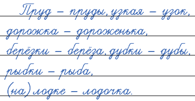 От дома к нему ведёт у..кая доро..ка. По берегам пруда растут молодые берё..ки и ду..ки. Вода в пруду чистая. В чистой, прозрачной воде мелькают ры..ки. Мы часто ходим на пру.. и катаемся на ло..ке.