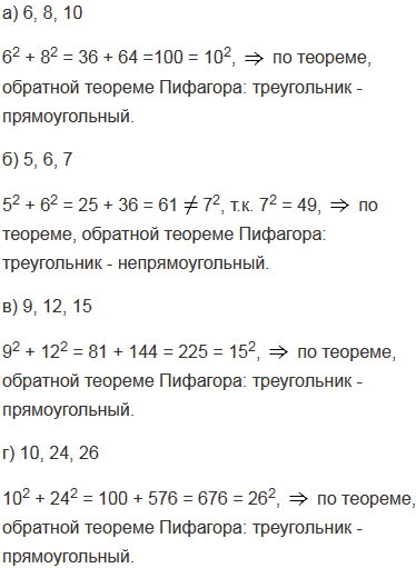 Выясните является ли треугольник прямоугольным, если его стороны выражаются числами: а) 6, 8, 10; б) 5, 6, 7; в) 9, 12, 15; г) 10, 24, 26; д) 3, 4, 6; е) 11, 9, 13; ж) 15; 20, 25. В каждом случае ответ обоснуйте.