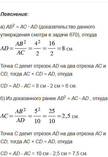 Через точку А проведены касательная АВ (В - точка касания) и секущая, которая пересекает окружность в точках С и D. Найдите СD, если: а) АВ = 4 см, АС = 2 см; б) АВ = 5 см, АD = 10 см.