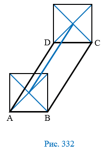 На сторонах АВ и СD параллелограмма АВСD построены квадраты так, как показано на рисунке 332. Используя параллельный перенос, докажите, что отрезок, соединяющий центры этих квадратов, равен и параллелен стороне АD.