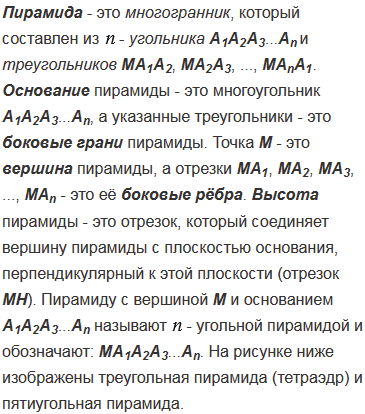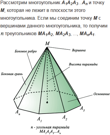 -угольной пирамидой; что такое основания, боковые грани, вершина, боковые ребра и высота пирамиды.