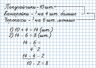 27. В зоомагазине было 10 волнистых попугайчиков, канареек на 4 больше, чем попугайчиков, а черепах на 6 меньше, чем канареек. Сколько было черепах?