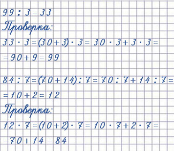 | 99 : 33 = 3 Проверка 3 • 33 = 99 | 84 : 7 = 12 Проверка 12 • 7 = 84 |