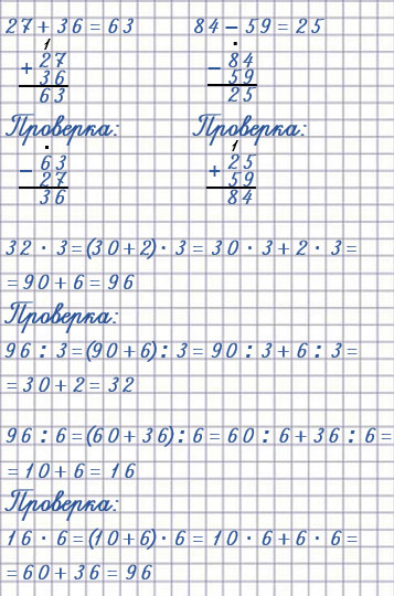 | 27 + 36 | 84 - 59 | 32 • 3 | 96 : 6 |