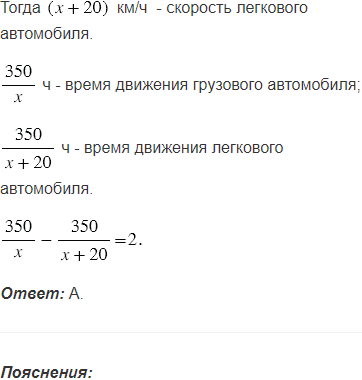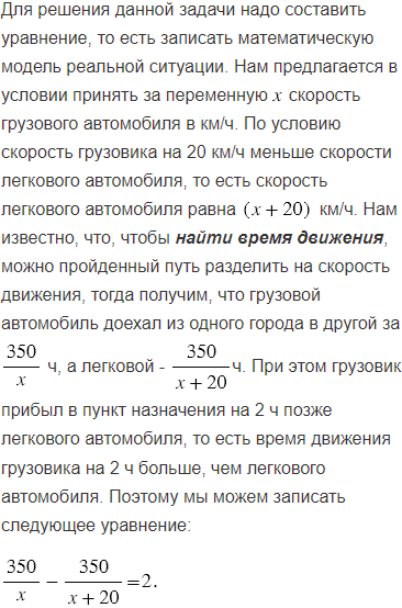 Из одного города в другой, расстояние между которыми равно 350 км, выехали одновременно грузовой и легковой автомобили. Скорость грузовика на 20 км/ч меньше скорости легкового автомобиля, в результате чего грузовик прибыл в пункт назначения на 2 ч позже легкового автомобиля.