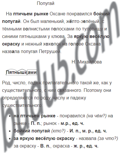 С тёмными полосками - (с чем?) с полосками - Т. п., мн. ч.. Яркую весёлую окраску - (что?) окраску - В. п., ед. ч., ж. р.. На птичьем рынке - (на чём?) на рынке - П. п., ед. ч., м.р.. Бойкий попугая - (кто?) попугай - И. п., ед. ч., м. р..