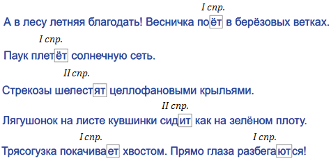 А в лесу летняя благода́ть! Весни́чка ... в б..рёзовых ветках. Паук ... солнечную сеть3. Стреко́зы ... целлофа́новыми крыльями. Л..гушо́нок на листе кувш..нки ... как на з..лёном плоту. Трясогу́зка ... хвостом. Прямо глаза разб..га́ются!