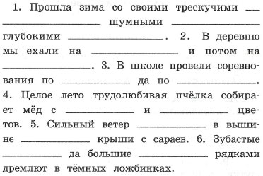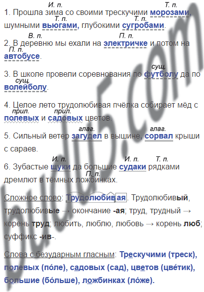 Слова для справок: морозами, вьюгами, сугробами; электричке, автобусе; футболу, волейболу; полевых, садовых; загудел, сорвал; щуки, судаки.