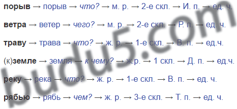 Имена существительные в предложении это: порыв, ветра, траву, (к) земле, реку, рябью.