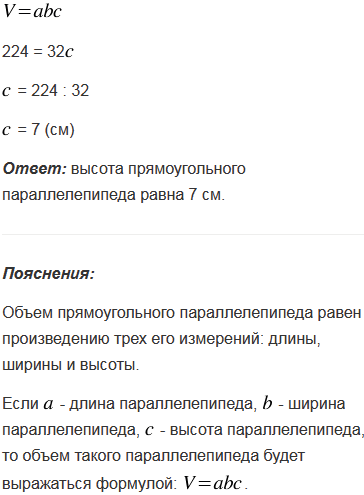 Найдите высоту прямоугольного параллелепипеда, если площадь его верхней грани равна 32 см2, а объем - 224 см3.