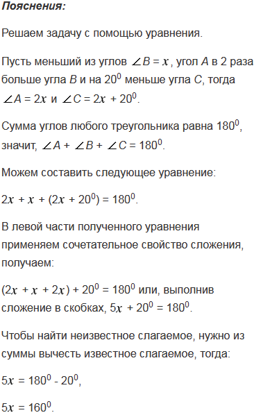 В треугольнике АВС угол А в 2 раза больше угла В и на 200 меньше угла С. Найдите три угла треугольника АВС.