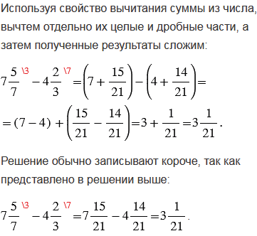 2) если дробная часть уменьшаемого больше дробной части вычитаемого, то надо отдельно вычесть целые и отдельно дробные части и результаты сложить;