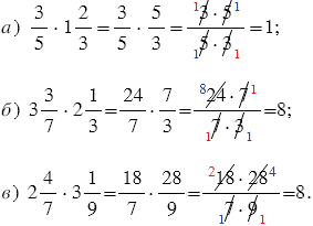 Чтобы выполнить умножение смешанных чисел, нужно записать эти числа в виде неправильных дробей, а затем воспользоваться правилом умножения дробей.