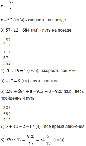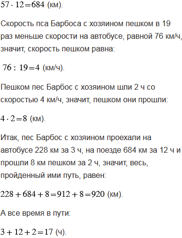 Пес Барбос с хозяином ехали на автобусе 3 ч со скоростью 76 км/ч, затем 12 ч - ехали на поезде и 2 ч шли пешком со скоростью, в 19 раз меньшей скорости автобуса. Найдите их среднюю скорость передвижения, если скорость автобуса составляет