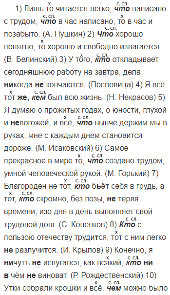 1) Лишь то читается легко что написано с трудом, что в час написано то в час и позабыто. (А. Пушкин) 2) Что хорошо понятно то хорошо и свободно излагается. (В. Белинский) 3) У того кто откладывает сегодн..шнюю работу на завтра дела (н..) когда (н..)кончаются. (Пословица) 4) Я всё тот(же) кем был всю жизнь. (Н. Некрасов) 5) Я думаю о прожитых годах о юности глухой и (не)погожей и всё что нынче держим мы в руках мне с каждым днём становится дороже. (М. Исаковский) 6) Самое прекрасное в мире то что создано трудом умной человеческой рукой.4 (М. Горький) 7) Благороден не тот кто б(?)ёт себя в грудь а тот кто скромно без позы (н..)теряя времени изо дня в день выполняет свой трудовой долг. (С. Конёнков) 8) Кто с пользою отечеству труди(т, ть)ся тот с ним легко (н..)разлучи(т, ть)ся. (И. Крылов) 9) Конечно я (н..)чутъ (н..)испугался как всякий кто (н..)(в)чём (н..)виноват. (Р. Рождественский) 10) Утки собрали крошки и всё чем можно было поживиться. (В. Астафьев) 11) Наибольшие трудности переживаем мы те кому за тридцать. (В. Астафьев) 12) Тот кто хочет чего-то достичь должен быть (н..)инертным а очень активным.(В. Розов)