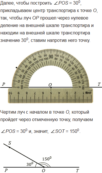 Для того чтобы начертить угол с заданной градусной мерой, необходимо совместить начало луча, который определяет одну из сторон угла, с центром транспортира, так, чтобы этот луч прошел через нулевое деление шкалы транспортира, найти на шкале транспортира нужную градусную меру и провести через это значение вторую сторону угла.