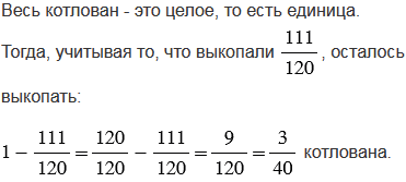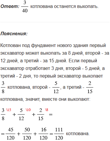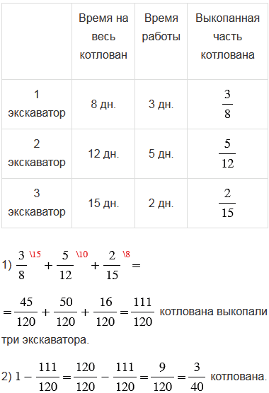 Котлован под фундамент нового здания первый экскаватор может выкопать за 8 дней, второй - за 12 дней, а третий - за 15 дней. Какую часть котлована останется выкопать после того, как первый экскаватор отработает 3 дня, второй - 5 дней, а третий - 2 дня?