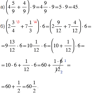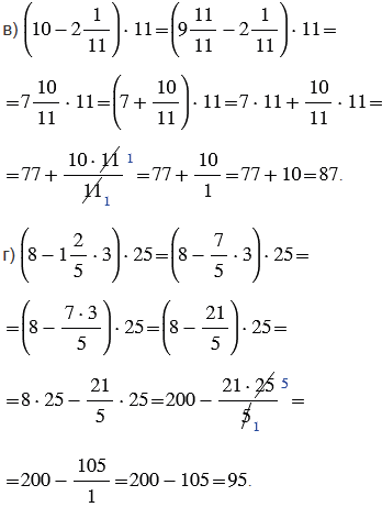 Чтобы найти значения данных выражений, сначала находим значение выражений в скобках, а затем, используя распределительное свойство умножения, выполняем умножение смешанного числа на натуральное число.
