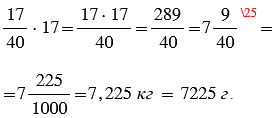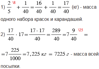 Чтобы умножить обыкновенную дробь на натуральное число, нужно ее числитель умножить на это число, а знаменатель оставить без изменения. При вычислениях получилась неправильная дробь (числитель больше знаменателя), ее нужно преобразовали в смешанное число. Чтобы неправильную дробь, числитель которой нацело не делится на знаменатель, преобразовать в смешанное число, надо числитель разделить на знаменатель; полученное неполное частное записать как целую часть смешанного числа, а остаток - как числитель его дробной части. Затем, используя основное свойство дроби, преобразовали полученное смешанное число в десятичную дробь, а далее, учитывая то, 1 кг = 1000 г, получили массу всей посылки в лагерь.