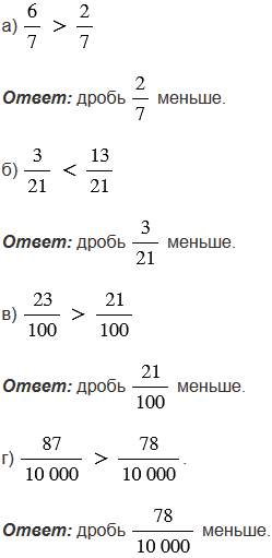 При сравнении дробей опираемся на правило, согласно которому из двух дробей с одинаковыми знаменателями больше та, у которой числитель больше, и меньше та, у которой числитель меньше.
