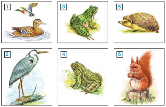1, 2 – птицы; 3, 4 – земноводные; 5, 6 – звери.