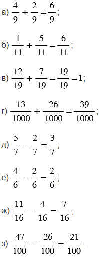 При вычитании дробей с одинаковыми знаменателями опираемся на следующее правило: чтобы найти разность двух дробей с одинаковыми знаменателями, нужно из числителя уменьшаемого вычесть числитель вычитаемого, а знаменатель оставить прежним.
