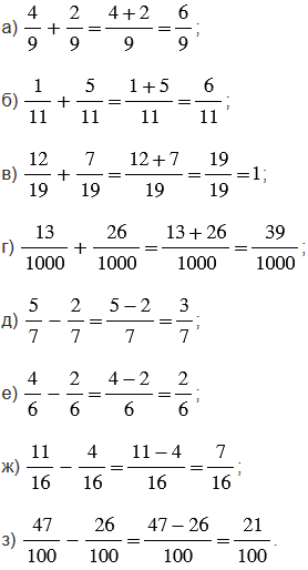 При сложении дробей с одинаковыми знаменателями опираемся на следующее правило: чтобы найти сумму двух дробей с одинаковыми знаменателями, нужно сложить их числители, а знаменатель оставить прежним.