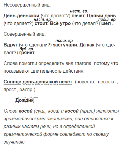 1. Солнце день-деньской печёт.4 (Е. Трутнева) 2. Целый день оно стоит на страже, бережёт сады, поля, дубравы. (Е. Трутнева) 3. Вдруг по крышам, по листам, редкие вначале, тут и там и тут и там капли застучали. Да как сразу грянет гром! (Е. Трутнева) 4. В полях, не кошенных косой, всё утро дождик2 шёл косой. (Л. Степанов)