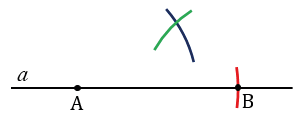 Далее, с помощью циркуля измеряем отрезок ОЕ и строим окружность с центром в точке А радиуса ОЕ (всю окружность строить необязательно, смотри, выделенное синим цветом).